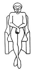 Kruis één pols over de ander pols, op je gevoel. Draai je handpalmen naar elkaar toe. Verstrengel je vingers in elkaar. Laat je handen ontspannen rusten in je schoot (zie plaatje).